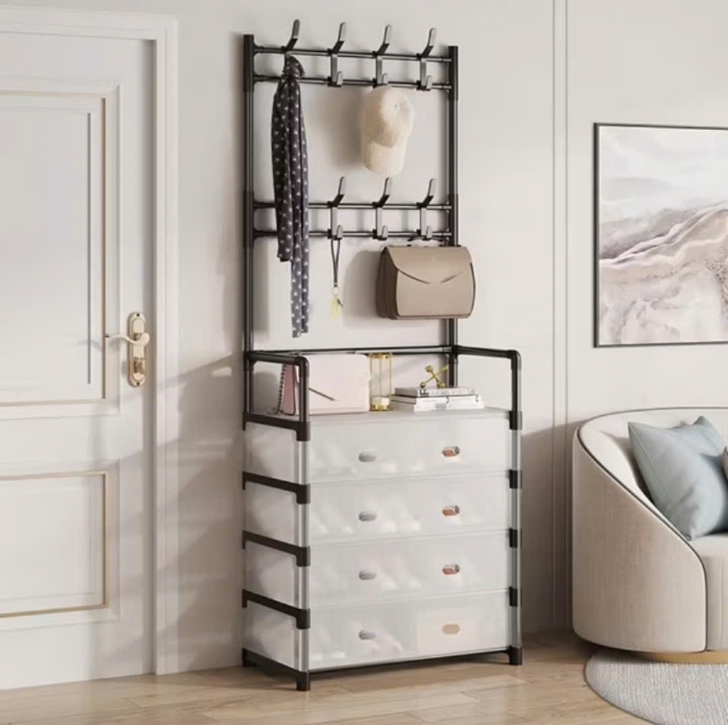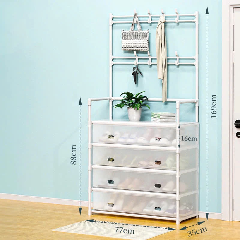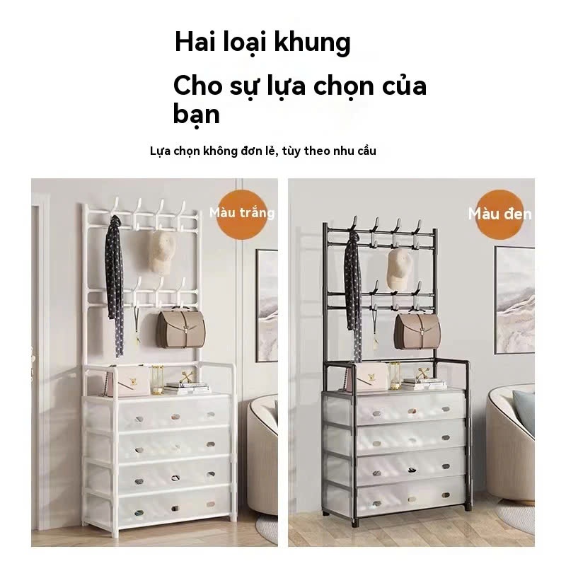 Phía dưới kệ là các giá để giày dép, hộp để đồ gấp gọn