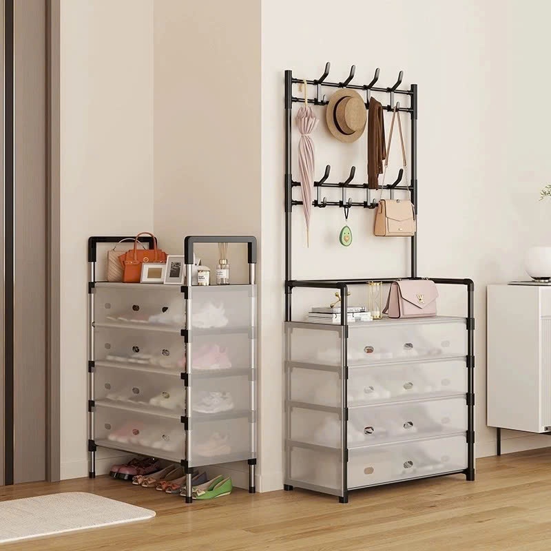 Kệ 5 Tầng chữ H Để Giày Dép Có Màng Chắn Bụi, Kệ Giày Dép 5 Tầng Khung Thép, Kèm 8 Móc Treo Đồ